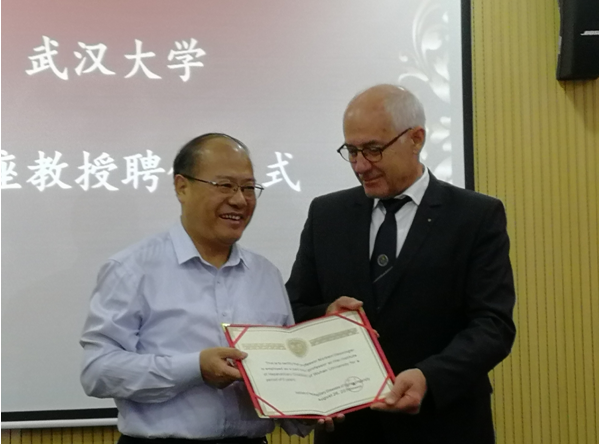 中德生物医学中心主任胡康洪教授介绍了二位专家的工作简历,并表示二位专家的加盟将显著促进该中心的国际交流和科研发展。刘德富校长代表学校向二位专家颁发了聘书,余祥庭部长代表武汉大学向Senninger院士颁发了武汉大学客座教授聘书。
