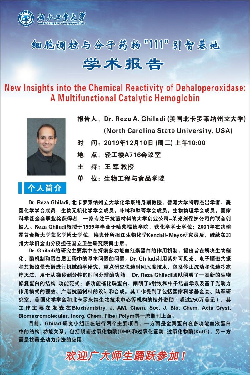 报告人:Dr. Reza A. Ghiladi 美国北卡罗莱纳州立大学(North Carolina State University, USA)